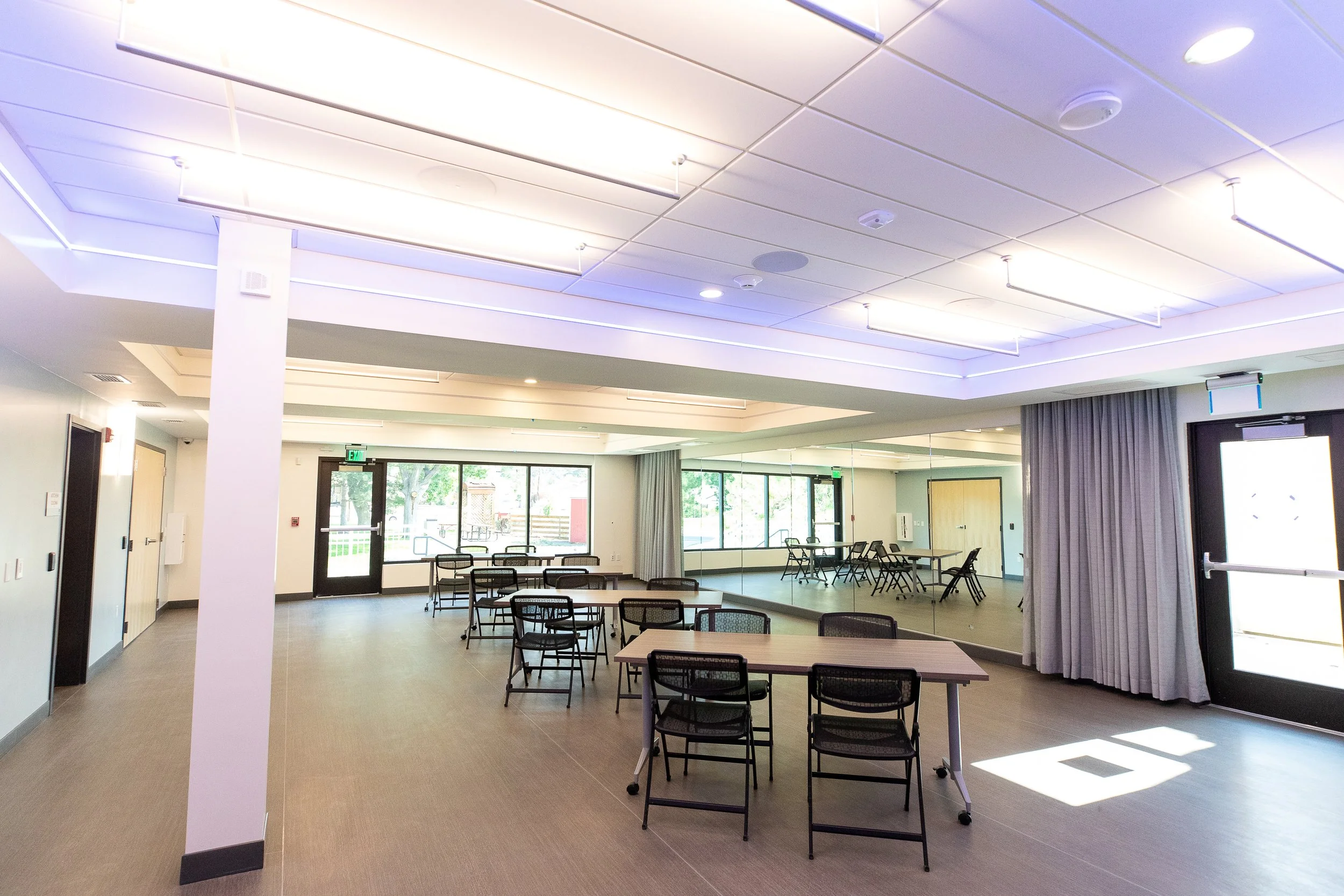 The Community Room at the Swim & Fitness Center offers a cozy, garden-view setting—perfect for small gatherings. With a kitchen and customizable lighting, it’s ideal for casual get-togethers or special celebrations.